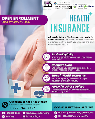 LETI is working with Public Health of Seattle & King County to connect the community with certified healthcare navigators ready to assist you with applying and reviewing your options!