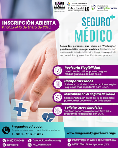 LETI colabora con Salud Pública de Seattle y el Condado de King para conectar a la comunidad con asesores de salud certificados, listos para ayudarle a solicitar y revisar sus opciones.